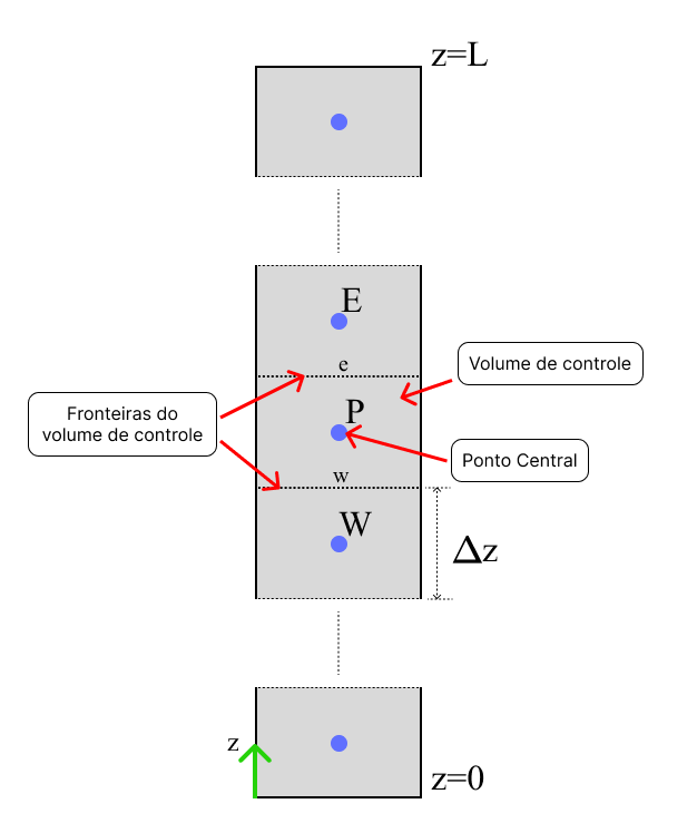 Importante notar que no fim da coluna, \(z=0\), e no topo da coluna, \(z=L\), existe apenas uma fronteira, visto que estão nos limites do domínio.