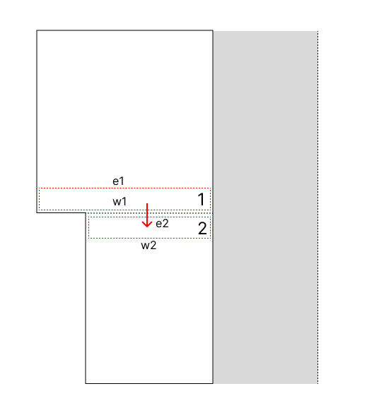 O efeito de variação da seção transversal da região anular pode ser modelado a partir do balanço de massa entre as células adjacentes a descontinuidade geométrica. O fluxo de sólidos do nó anterior a descontinuidade (1) é imediatamente injetado no volume posterior (2), assim como ilustra a figura a seguir:
